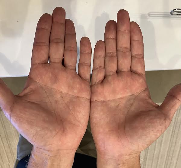 先日患者様の手を見ると、なんと両手にますかけ線!!